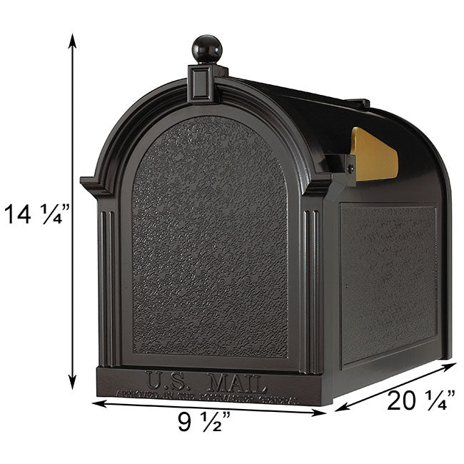 Distinguish your home from others on your street with the Whitehall Black Deluxe Mailbox. This lasting receptacle is made from die cast, rust-free aluminum and powder coated with a weather resistant, lovely black finish. The mailbox is approximately 20% larger than standard boxes, and is thus perfect for several days of mail or small packages. Its durable hinge hardware remains protected from the elements, and the magnetic door closure will last a lifetime. Personalize the item with custom plaques and toppers (sold separately) for a more dramatic look. Add curb appeal to your home with this Black Deluxe Mailbox.