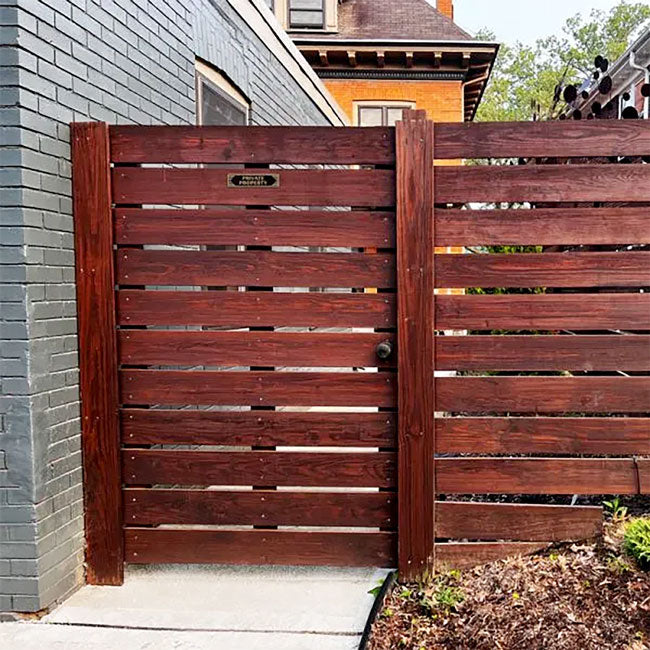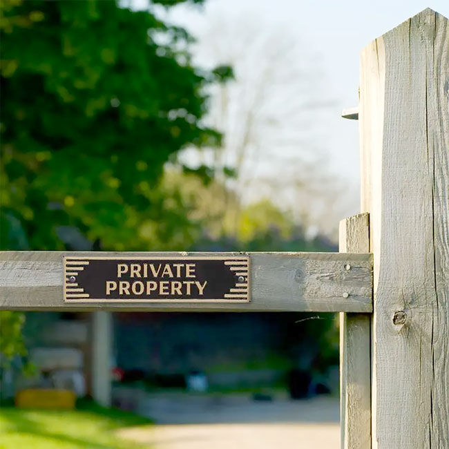 - Neatly displayed "Private Property" message keeps unwanted visitors off your grounds